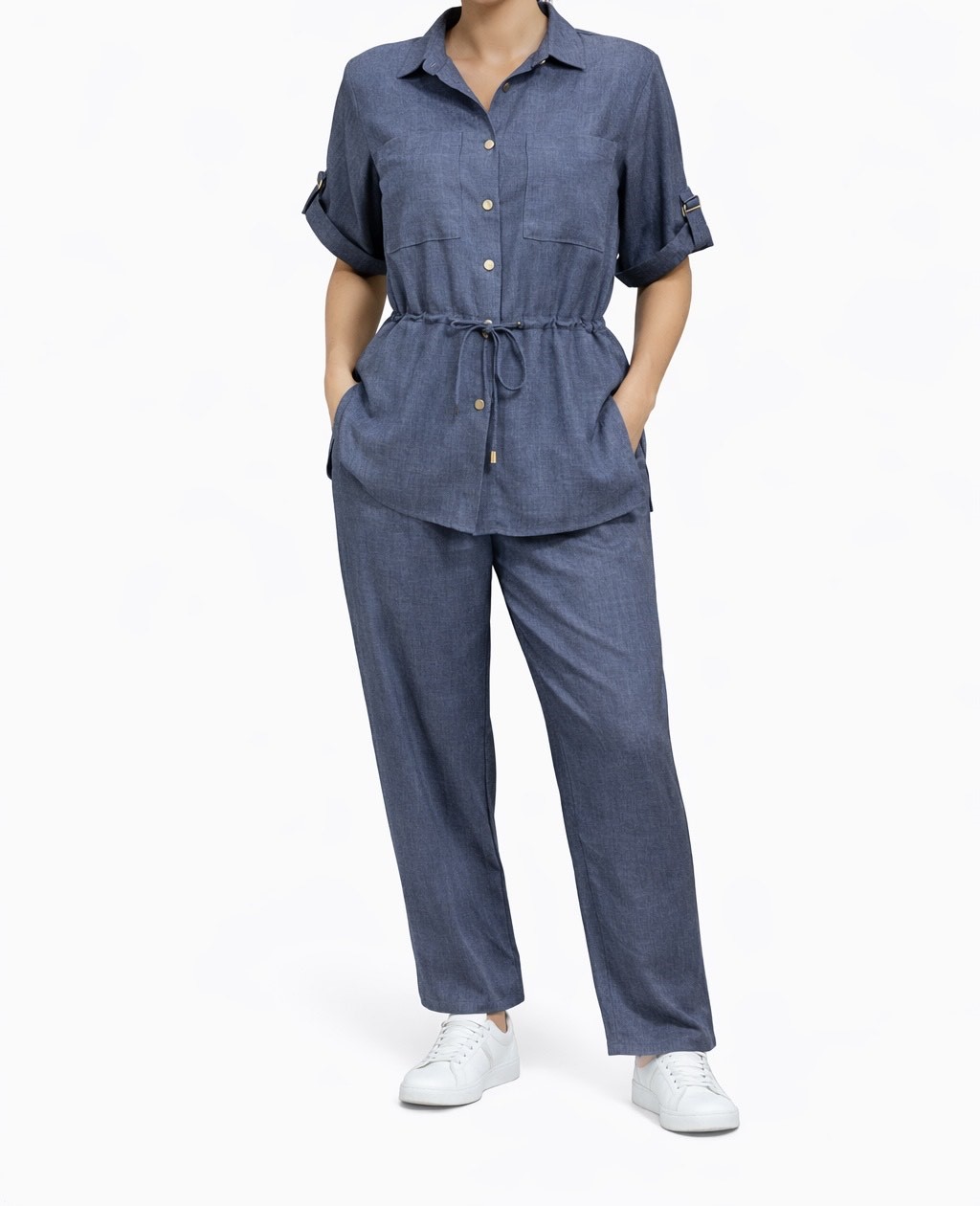 “Indigo Nomad” donosi modernu interpretaciju klasične košulja-siluete u dubokoj, smirenoj plavoj nijansi. Strukirani detalj sa vezicom daje ženstvenu formu, dok opuštene pantalone stvaraju lakoću pokreta.