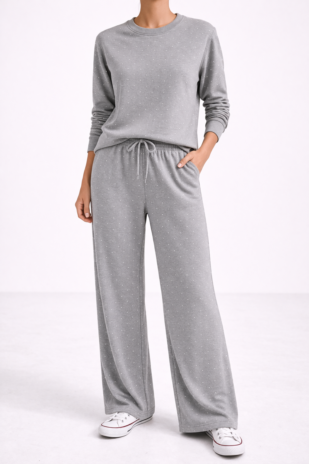 Ovaj komplet donosi savršen balans između udobnosti i modernog stila u vašu garderobu. Sa suptilnim tačkastim detaljima i opuštenim krojem, predstavlja idealan izbor za svakodnevne kombinacije koje izgledaju effortless, ali dotjerano. Široke nogavice pružaju dodatnu dozu elegancije i slobode pokreta, dok mekani materijal osigurava maksimalnu udobnost tokom cijelog dana. Bilo da ga nosite za šetnju, putovanje ili opušteni izlazak – ovaj set će brzo postati vaš favorit. Izrađen je od laganog i prijatnog materijala koji nježno prati liniju tijela.